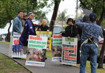 A small group of eight people from the racist, far right "Party For Freedom" held a protest outside Woolworth's supermarket in Marrickville on July 26. They were objecting to a sign saying "Happy Ramadan" the store had put up earlier in the week. The Party for Freedom is a newly formed group that grew out of the white nationalist Australian Protectionist Party.