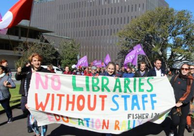 More than 200 staff and students rallied outside Fisher Library at Sydney University on August 13 to protest proposed cuts to the university's library system. The cuts will involve closures and staff redundancies. "If the university gets its way all four libraries will lose their staff and collections. Two will become little more than post-grad only PC labs," the Community and Public Sector Union (CPSU) said.