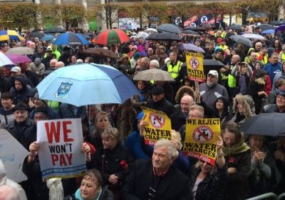 More than 200,000 people demonstrated on streets up and down the country in protest against water charges. Even in the smaller towns across Ireland, people marched in their thousands, while cities crowd numbers were in the tens of thousands. About 30,000 braved incessant rain in Cork city. The march took almost an hour-and-a-half to make its way through Cork city centre. Among the politicians protesting was Sinn Fein’s Jonathan O’Brien, who said: “The government needs to recognise the numbers on the streets. People are not going to pay, it is a tax too far.”