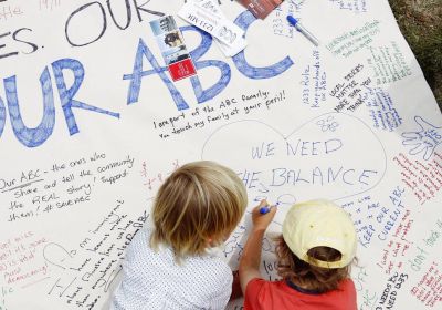 Carrying signs declaring "Hands off our Aunty", and "Save our local ABC", supporters of the ABC rallied outside the ABC's North Coast NSW studio in Lismore on November 20. The protest formed one of a series of rallies around the country in support of the national broadcaster over the week of November 18 to 25, called by unions and the Friends of the ABC. -
