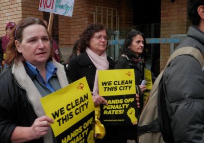 Cleaners held rallies around Australia on June 15 to celebrate International Justice for Cleaners Day. In Canberra, angry Parliament House cleaners went on strike for the day. At a rally outside Parliament House, they awarded federal treasurer Joe Hockey a giant golden toilet brush. Yahoo news reported: "The cleaners have walked off the job for 24 hours from 6.30am on Monday, protesting a federal government decision to abolish Commonwealth Cleaning Services guidelines. -