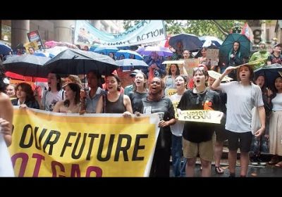 Torrential rain did not stop student climate strikers from marching through the streets of Sydney. Video by Peter Boyle.