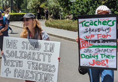 Teachers and unionists protested showed their support for high school teacher Jason Wong, who is facing disciplinary action for supporting Palestine. Jacob Andrewartha reports.