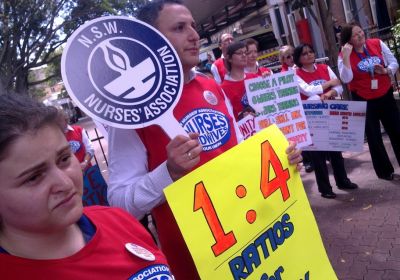 For the second week in a row, nurses held lunchtime rallies outside their hospitals in support of the NSW Nurses Association campaign for a mandated minimum nurse to patient ratio of 1:4 in public hospitals. This ratio has been mandated in Victoria for 10 years but NSW lags behind. Lower ratios in NSW have meant poorer care for patients and have also placed nurses in danger.