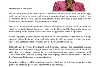Marrickville Mayor Fiona Byrne has received a letter of support from South African anti-apartheid campaigner Archbishop Desmond Tutu. The letter appears below. * * * Dear Mayor Fiona Byrne, We in South Africa, who both suffered Apartheid and defeated it, have the moral right and responsibility to name and shame institutionalized separation, exclusion, and domination by one ethnic group over others. In my own eyes I have seen how the Palestinians are oppressed, dispossessed and exiled. -
