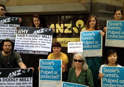 Friends of the Tamar Valley released the statement below on January 24. * * * ANZ branches around the country will be targeted tomorrow by the community seeking to halt Tasmanian logging company Gunns Ltd’s controversial Tamar Valley pulp mill. ANZ Bank is due to make a decision about extending a debt facility to Gunns at the end of the month.