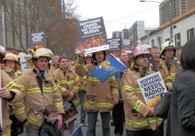 One thousand firefighters from around Victoria descended on parliament house on July 1 to protest Premier Denis Napthine’s cuts to the fire services budget. United Firefighters Union (UFU) state secretary Peter Marshall said that as of July 1, the Napthine government’s fire services levy collection will increase “from $322 million [in 2009] to $654 million [last year]. “The government is collecting more, but it is putting $157 million of the fire services levy in a bank account to help the government’s coffers”. One thousand firefighters from around Victoria descended on parliament house on July 1 to protest Premier Denis Napthine’s cuts to the fire services budget. United Firefighters Union (UFU) state secretary Peter Marshall said that as of July 1, the Napthine government’s fire services levy collection will increase “from $322 million [in 2009] to $654 million [last year]. “The government is collecting more, but it is putting $157 million of the fire services levy in a bank account to help the government’s coffers”.