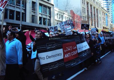 More than 500 people, mainly from the Egyptian community, rallied at Sydney's Town Hall Square and marched through city streets to the Egyptian consulate on August 18, in opposition to the military crackdown over recent days in Egypt. Speakers condemned the massacres committed by the military regime in Egypt against peaceful supporters of ousted president Mohamed Morsi. Chants during the march included, "Free, free Egypt!", "Egypt will soon be free!", and "General al-Sisi, assassin!'
