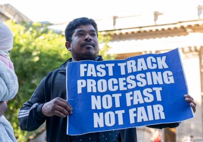Tamil refugee activist Aran Mylvaganam was arrested, then released, during a protest at federal immigration, citizenship and multicultural affairs minister Andrew Giles’ office. Kerry Smith reports.