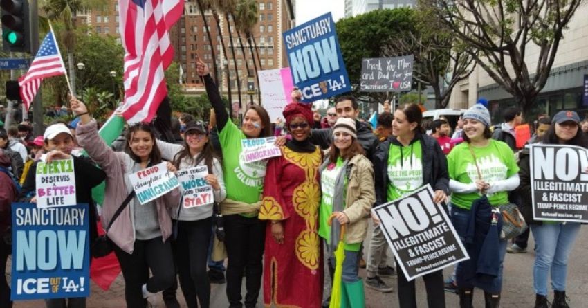 Meanwhile, thousands attended a February 18 "Free the People Immigration March" in downtown Los Angeles, whose organisers have drafted a "People's Declaration" that declares the city to be "a sanctuary for all". Among other demands, the march organizers call for "an immediate stop to the ICE raids and deportations" and vow to "rebel against Trump's actions at every step of the way."