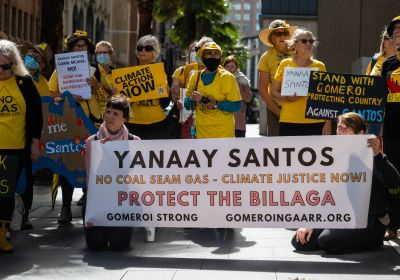 Protesters gathered outside the Federal Court to demand Santos withdraws its bid to try to override the Gomeroi’s opposition to a coal seam gas plant in the Pilliga Forest in north-west New South Wales. Jim McIlroy reports.