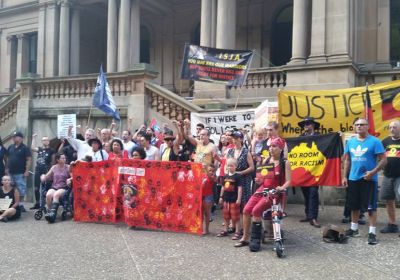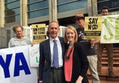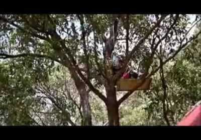 Activist Steffie Leedham is sitting on a platform high on a tree in Sydney Park. The platform is connected to two other big trees in the area of the park that has been fenced off for clearing to start building of the #WestConnex tollway and tunnel project's St Peters interchange.