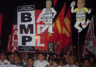 More than 1000 Philippine Airlines (PAL) ground staff from the Philippine Airlines Employees Association (PALEA) staged a torch-lit rally on April 1 between terminals at the Ninoy Aquino International Airport.