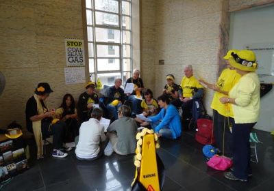 The Illawarra Knitting Nannas Against Gas (I KNAG), held a "knit-in", in Edgecliff in Sydney, at the office of Prime Minister Malcolm Turnbull on March 21. He was not there and had not answered the two simple questions the Nannas had left him earlier. “Do you support a ban on coal seam gas (CSG) mining in drinking water catchments?" and “Would you move federal legislation to enact a ban on CSG mining in drinking water catchments?”
