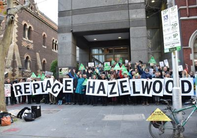 Protesters gathered in Melbourne on August 8 to urge the replacement Hazelwood Power Station with renewable energy. Australia's dirtiest power station, Hazelwood is owned by Engie France and Mitsui Japan. According to the OECD it is one of the world's most polluting power stations, both in terms of the toxic cocktail of chemicals it daily emits and its carbon emissions. Hazelwood is also Australia's least efficient power station and a major consumer of water: 1.31 megalitres of water is consumed per gigawatt hour of power generated.