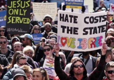 “No hate in our state,” read placards carried by protesters. They marched through the city just days after state legislators revised a controversial religious freedom law that failed to provide protection against discrimination.