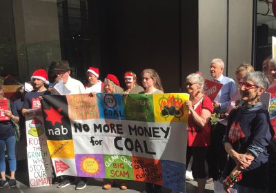 Anti-coal activists sang adapted Christmas carols outside the head office of National Australia Bank as part of the campaign to demand it end funding to all fossil fuel projects. Jim McIlroy reports.