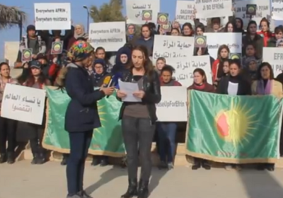 The marchers expressed their support for the resistance by women and others in the Afrin canton in Rojava against the fascist invasion from Turkey and Islamic gangs, which began last month — and in support of the feminist, multi-ethnic Rojava Revolution.