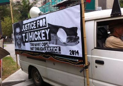 Protesters demanded police accountability over the death of Aboriginal teenager TJ Hickey, which occurred more than 10 years ago. Hickey died after being impaled on an iron fence in inner-city Waterloo, while being chased on his bike by a police van.